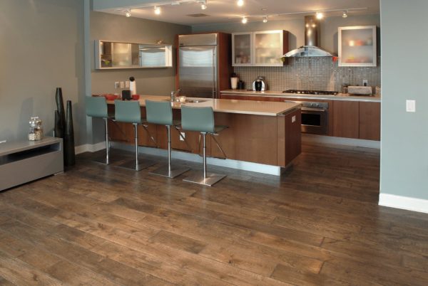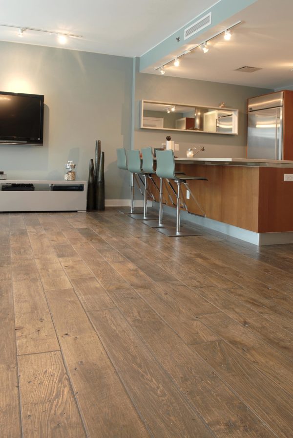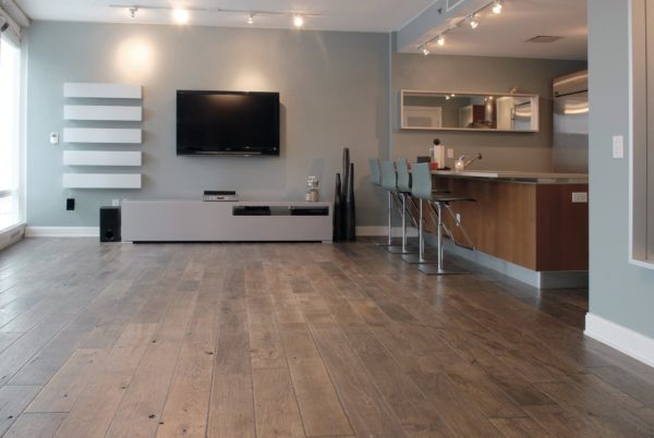 Floor: 6-3/4” wide-plank Vintage French Oak | Rustic Character | Victorian Collection hand scraped | heavy distress | pillowed edge | color Stone Grey | Satin Hardwax Oil