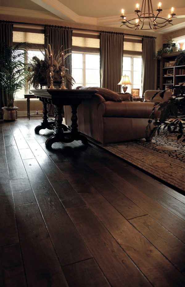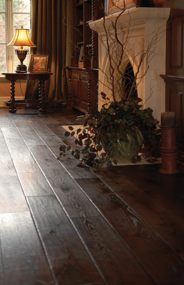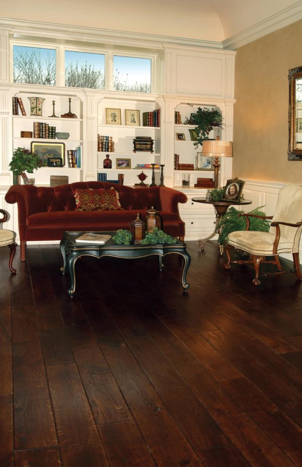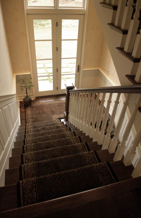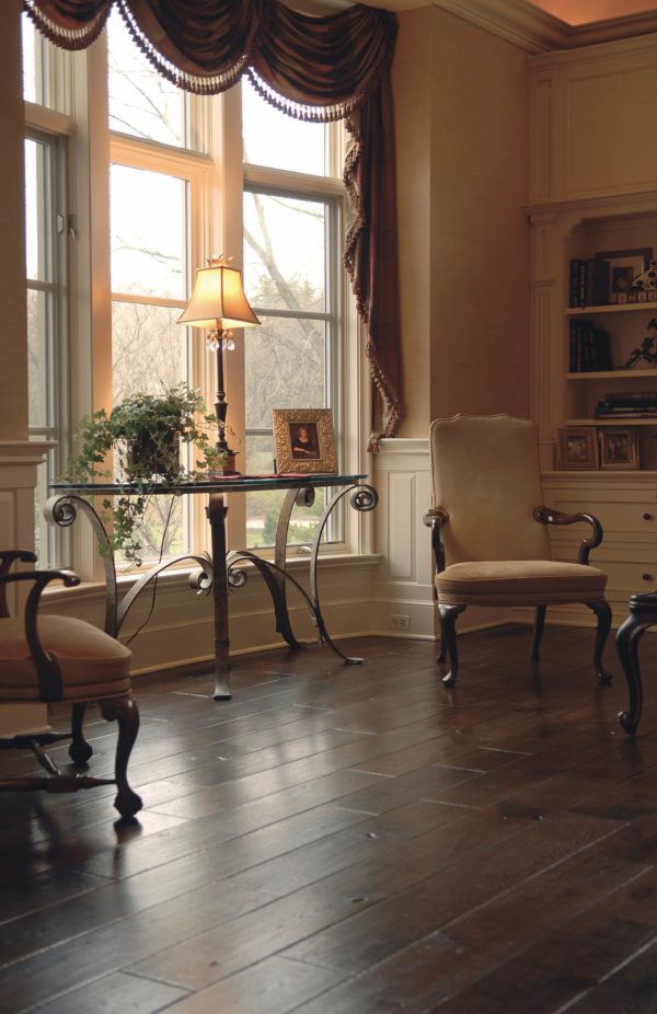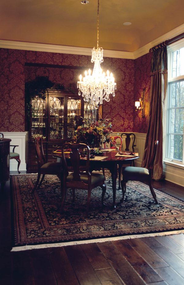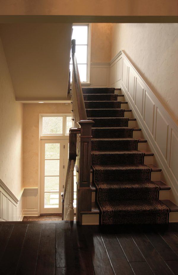 Thoughtful use of dark hues gives the impression of a bygone era. The beauty of light colored custom bookcases continues in chair rails and wainscoting throughout the home, highlighting its refinement.