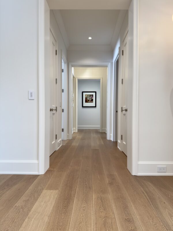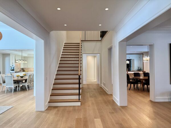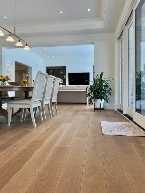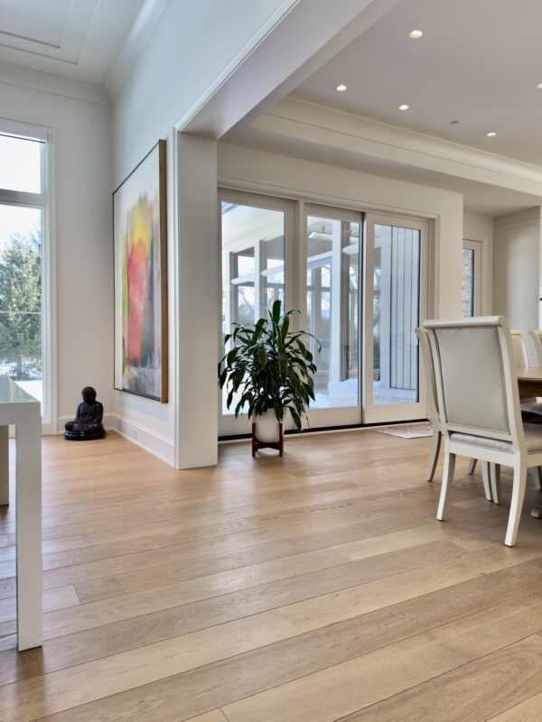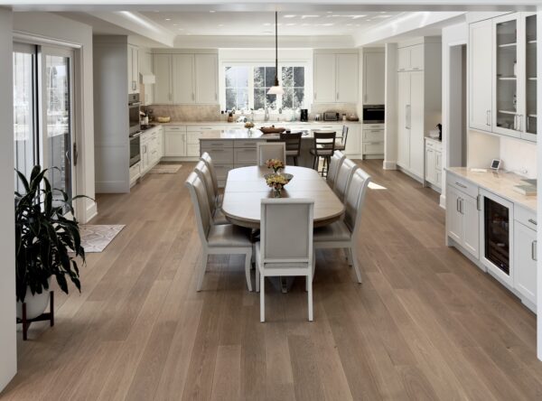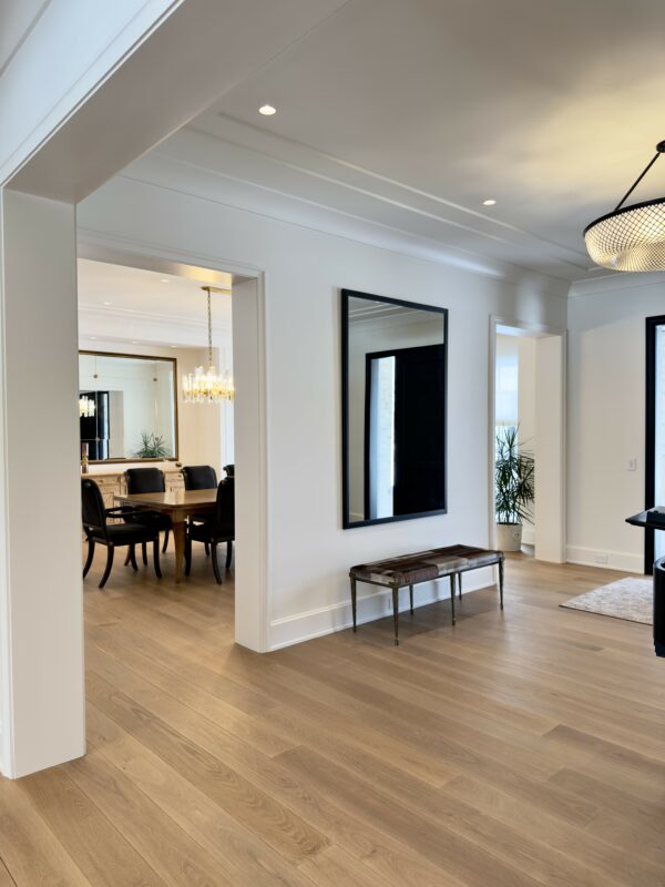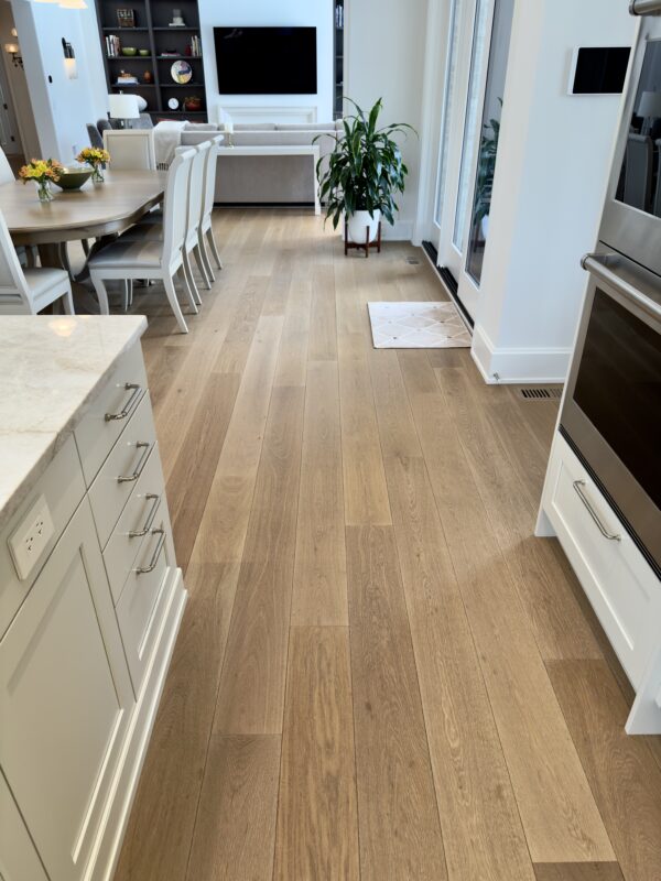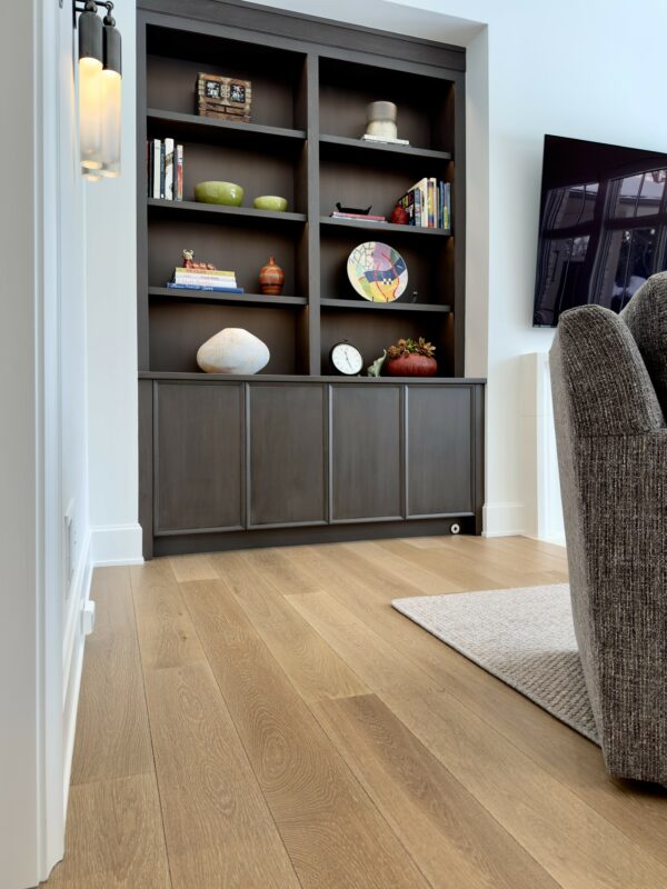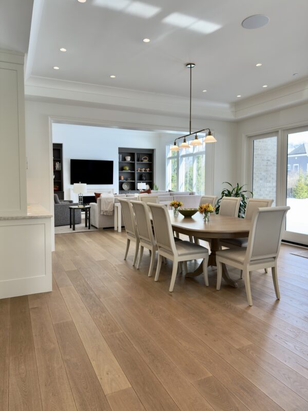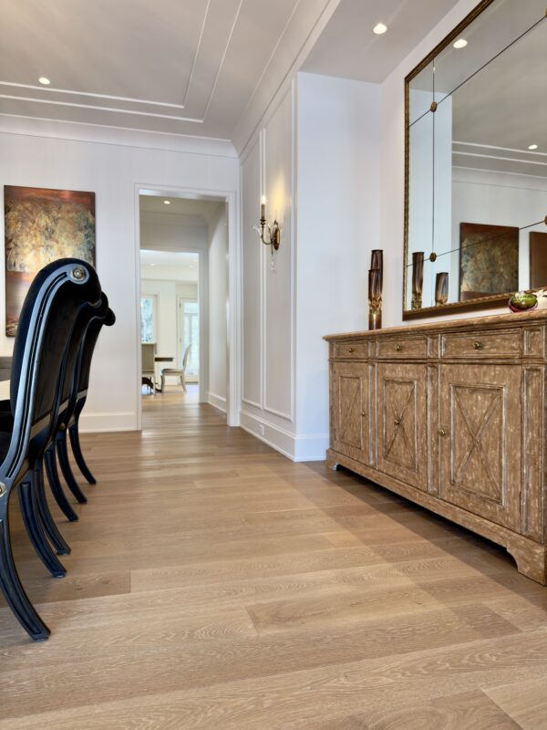 Understated and effortlessly refined, the wide-plank French Oak flooring sets the tone for the entire home. Its warm, natural grain moves seamlessly through kitchen, dining, and living spaces, creating a quiet continuity that grounds the architecture without overpowering it. The Kost finish captures light softly, adding depth and warmth while allowing the cabinetry, furnishings, and millwork to feel intentional rather than ornate.