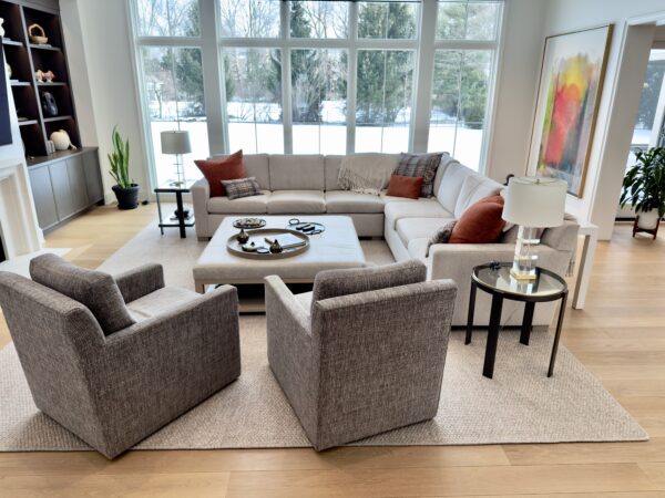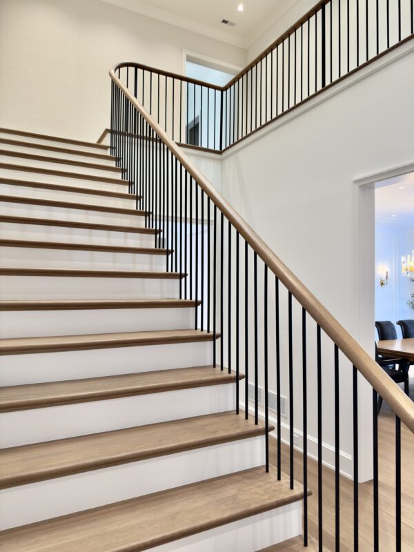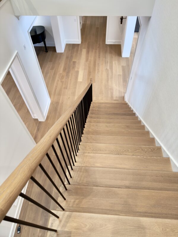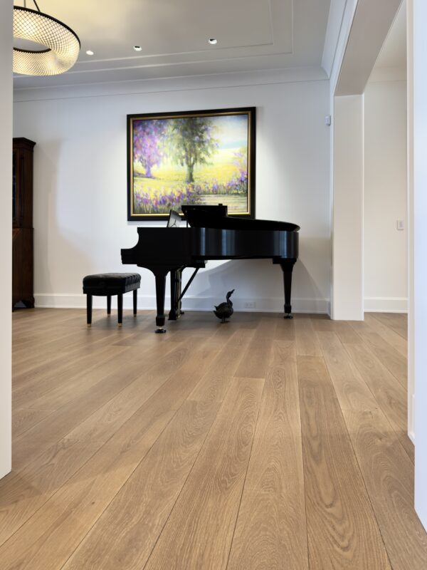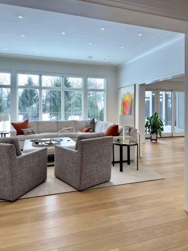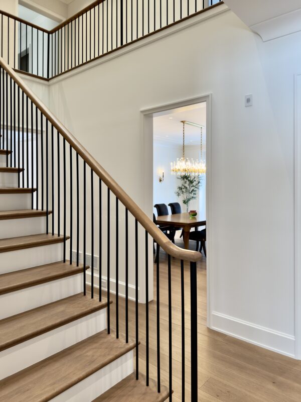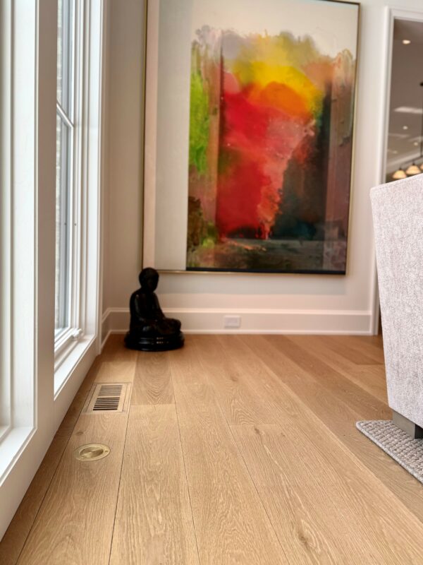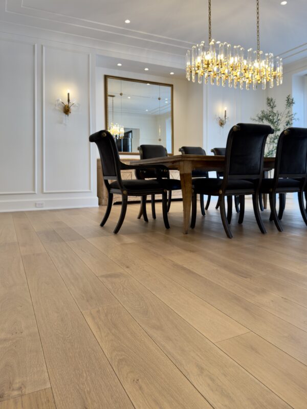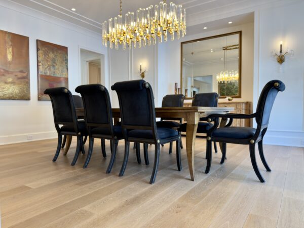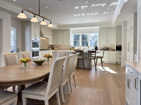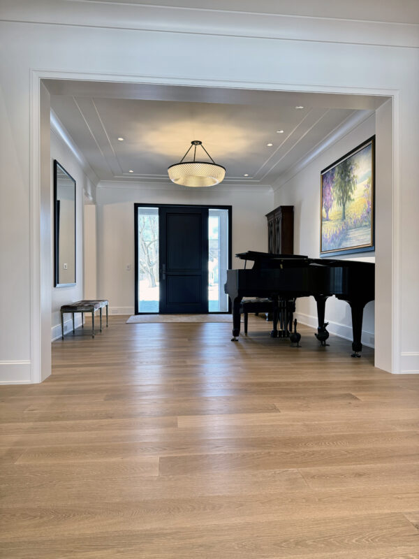Understated and effortlessly refined, the wide-plank French Oak flooring sets the tone for the entire home. Its warm, natural grain moves seamlessly through kitchen, dining, and living spaces, creating a quiet continuity that grounds the architecture without overpowering it. The Kost finish captures light softly, adding depth and warmth while allowing the cabinetry, furnishings, and millwork to feel intentional rather than ornate.