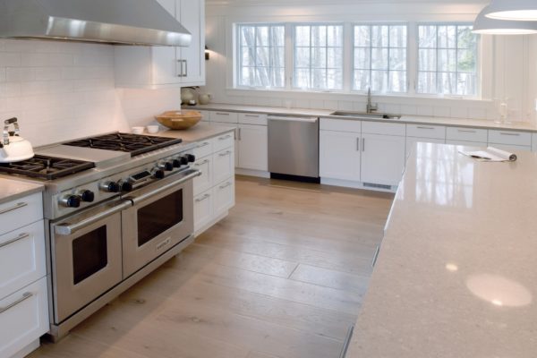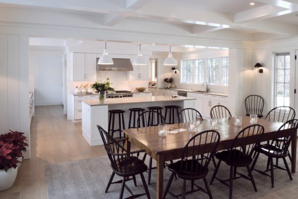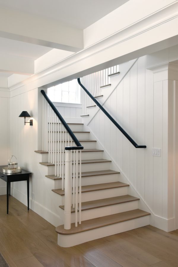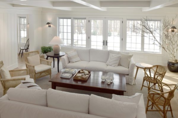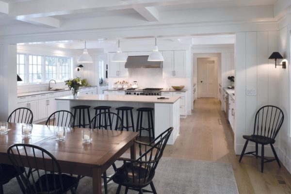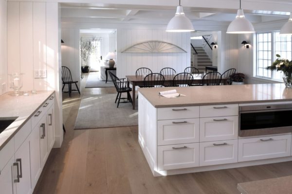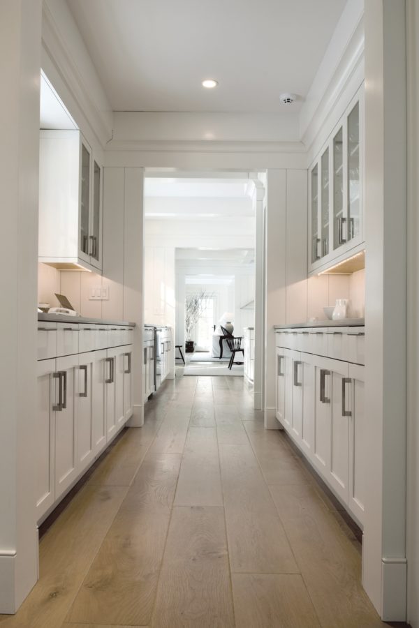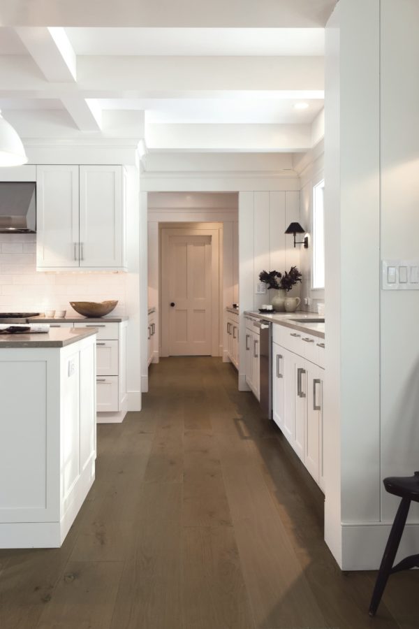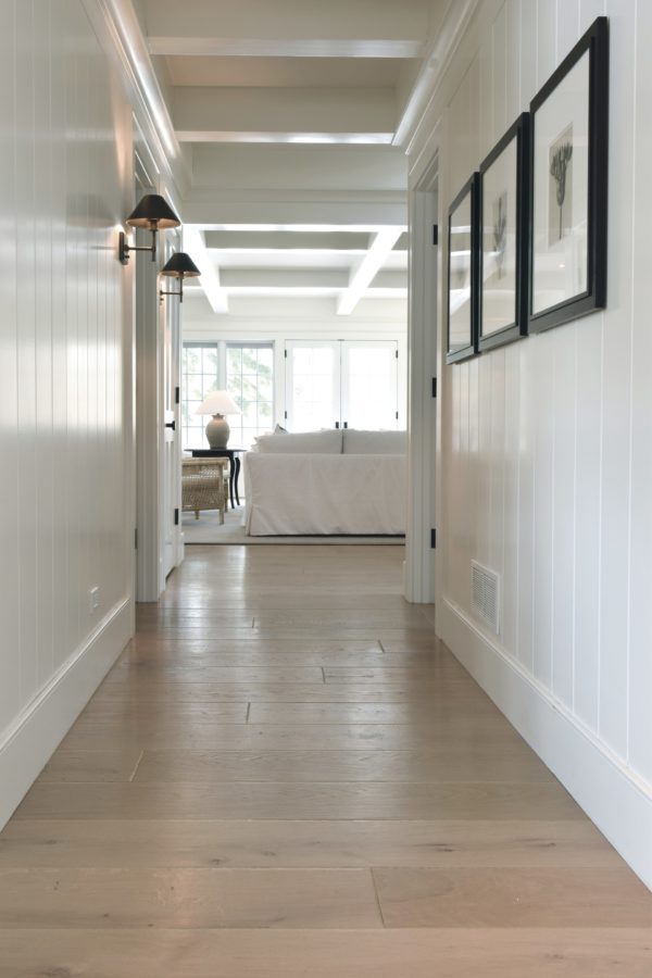This sanctuary-like home is light, bright, and airy with a relaxed yet elegant finish. White paneled walls and white beams forming the coffered ceiling let the light fill the space. Influenced by Scandinavian décor, the wide plank floor strikes the perfect balance of serenity in the design.