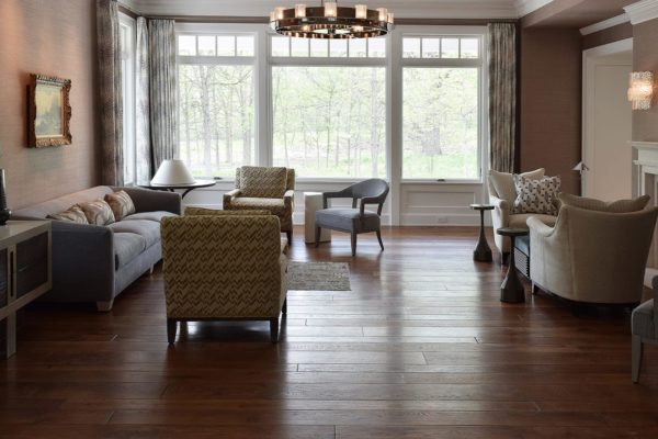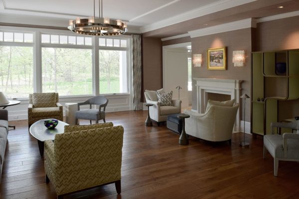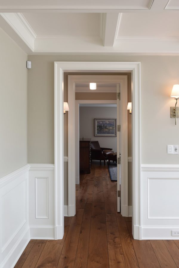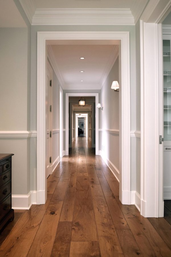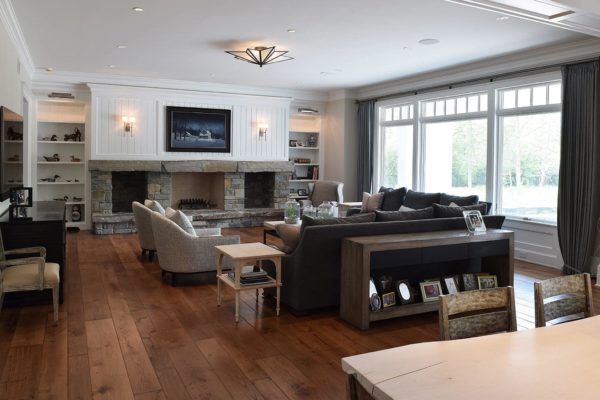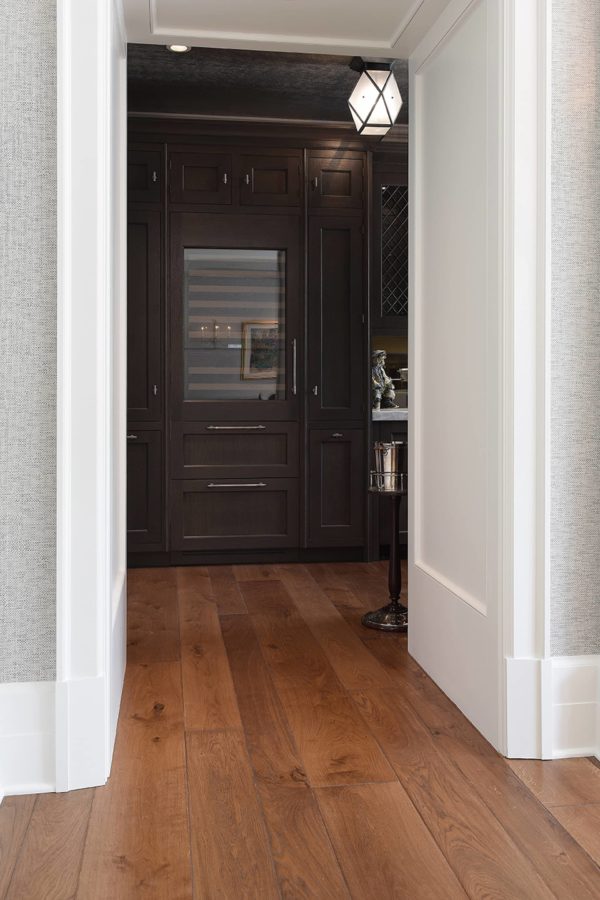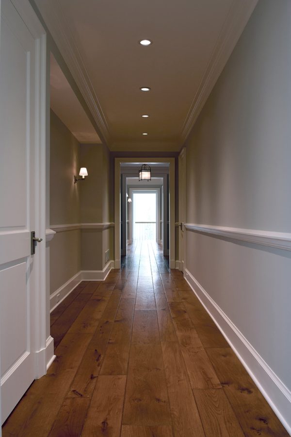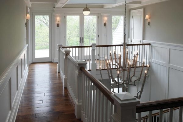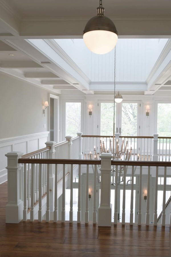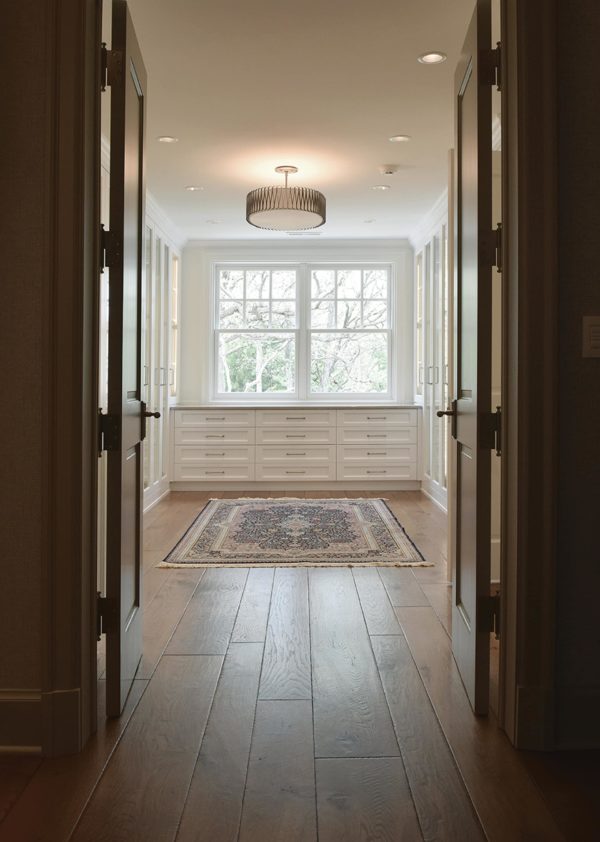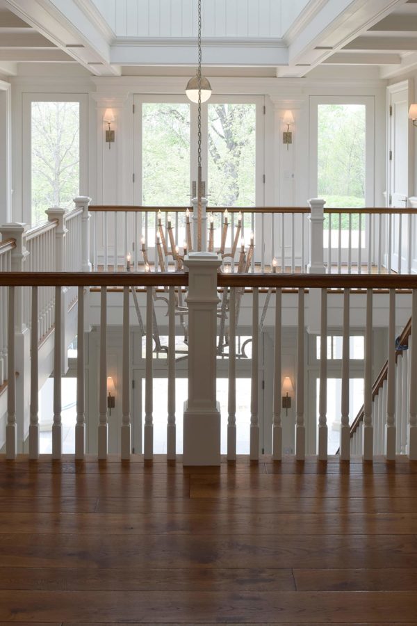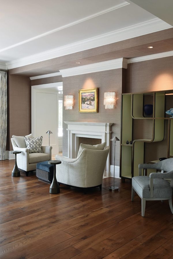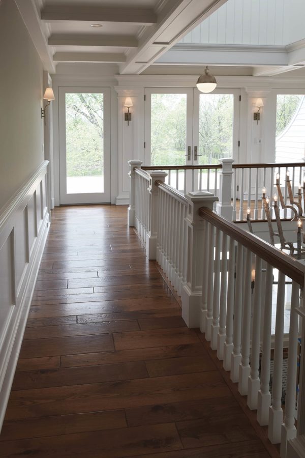 Elegant molding frames the luxurious neutral color palette and textured wall coverings. Across from the expansive quarry stone fireplace, picture windows overlook the adjoining copse. Upstairs, a light-filled gallery crowns the main entry hall.